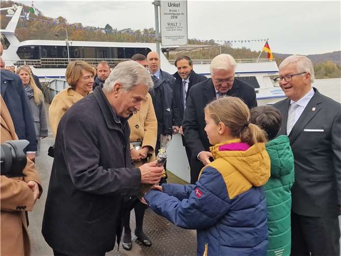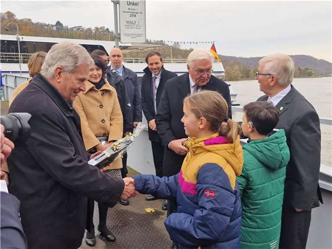 Am frühen Mittag reisten die Präsidentenpaare mit dem Schiff nach Unkel, wo sie von Verbandsbürgermeister Karsten Fehr und Stadtbürgermeister Gerhard Hausen herzlich empfangen und anschließend durch die Stadt geführt wurden. Auf dem Unkeler Marktplatz weckte eine ehemalige Telefonzelle, in der mittlerweile Bücher zur Ausleihe untergebracht sind, das Interesse des Bundespräsidenten, der den Inhalt dieser speziellen Leihbücherei daraufhin genauer inspizierte. Auf die Frage, ob er fündig geworden sei, erwiderte Steinmeier anschließend: „Ich hätte oben links anfangen und unten rechts aufhören können.“