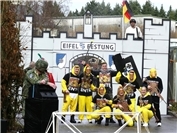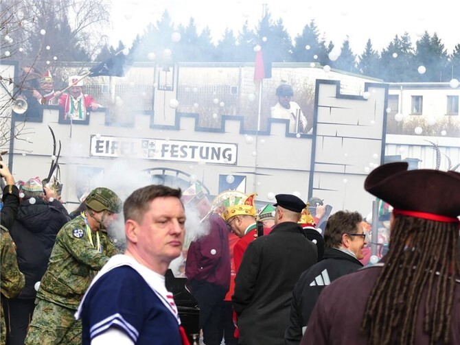 Die landeten zwar danach nicht auf dem Grill, mussten beim Einsatz jedoch reichlich Federn lassen. Alsbald schwiegen aufgrund der ausgehenden Munition die zuvor permanent feuernden Abwehrbatterien der Eifelfestung, so dass Kommandeur Akaltin auch seine Verkleidung als Pirat Jack Sparrow nichts nutzte und er die närrische Kapitulation offiziell bestätigten musste.
