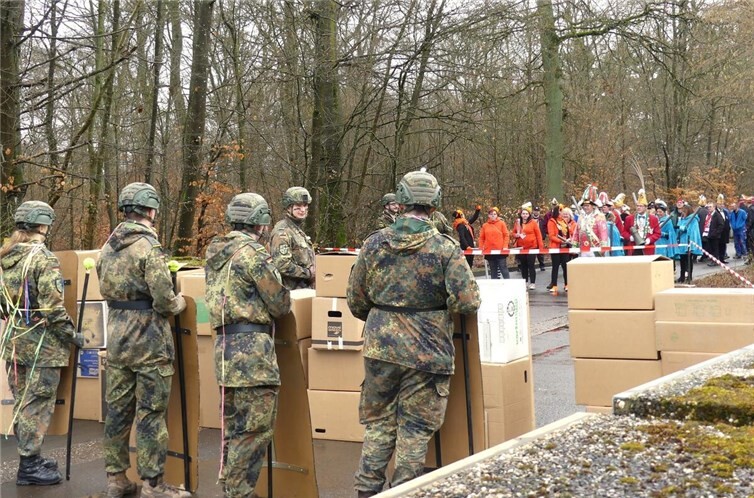 Unter der Führung von Kommandeur Oberst Dr. Ferdi Akaltin gaben sich die Verteidiger zwar alle Mühe, mussten dem massiven Angriffsdruck des kampferprobten Schwadron der Alten Großen Mayener Karnevalsgesellschaft, unter der Führung vom Generalfeldmarschall Prinzengarde und Stadtkommandant Albert Portz, aber schließlich weichen. Eine leichte Kartonwand, hölzerne Sperrgitter, rot-weißes Absperrband und eine Luftballonblockade eigneten sich zwar auf den ersten Blick für eine leichte Absperrung, boten allerdings nur wenig Schutz um die Mayener Narrenstreitmacht aufzuhalten.