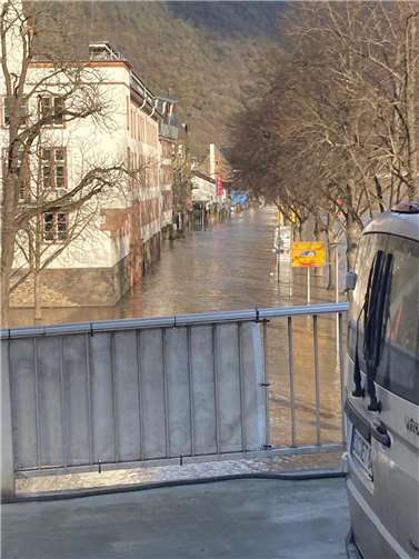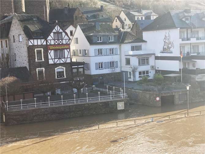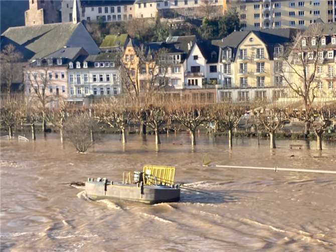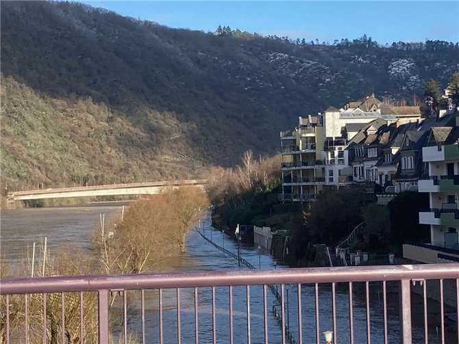 Das aktuelle Moselhochwasser hält auch im Landkreis Cochem-Zell derzeit wieder die Anrainer in Atem. Für Freitag mussten einmal mehr zahlreiche Keller, Wohnungen und Geschäfte entlang des Flusses schnell geräumt werden. Mittlerweile hat der Pegel in der Kreisstadt Cochem die 7,30-Marke erreicht. Der amtlichen Hochwasservorhersagezentrale zufolge, soll dieser Pegelstand bis gegen 20 Uhr am Freitagabend noch auf 7,70 m steigen. Tendenz steigend. Da derzeit die Skagerrak-Brücke weiterhin wegen Baumaßnahmen gesperrt ist, erfolgt die Umleitung des Fahrzeugverkehrs in Richtung Eifel, aktuell noch über die neue Moselbrücke und die bisher noch nicht überflutete Ravenéstraße in Richtung Autobahn 48. TE