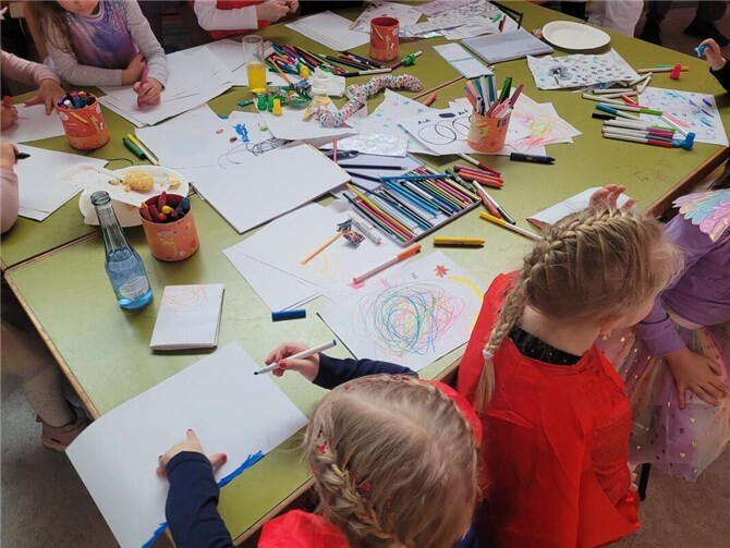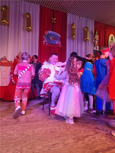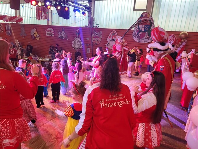 Zwischen den Programmpunkten durften die Kinder immer wieder selbst aktiv werden: Gemeinsam mit der Prinzengarde wurde auf der Bühne getanzt, und es zog eine fröhliche Polonäse durch den gesamten Saal. Neben den Bühnenauftritten warteten ein Kuchenbuffet sowie ein Maltisch, an dem die Kinder kreativ werden konnten, auf die Gäste.