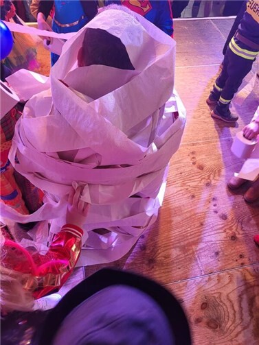 Auch Erpels Jubiläumsprinzenpaar Rainer und Sabine ließ es sich nicht nehmen, kräftig Kamelle unter die jungen Jecken zu werfen. Die beiden versprachen bereits jetzt, dass es beim Karnevalszug am 15.02.2026 noch deutlich mehr Kamelle regnen werde. Für großen Spaß sorgte zudem ein Spiel, bei dem Prinz Rainer, Stadtkommandant Markus Schmitz und Adjutant Andreas Schwager von den Kindern mit Toilettenpapier in Mumien verwandelt wurden – sehr zur Freude des Publikums.