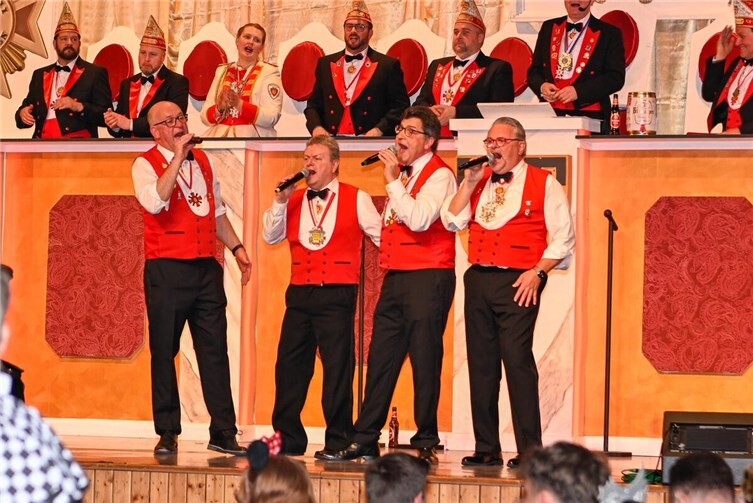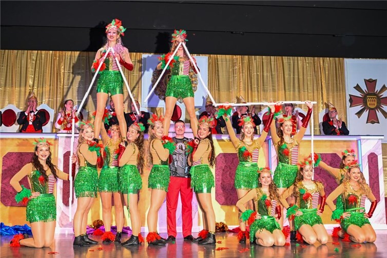 Die Tanzgruppe „Herrenzimmer“ sorgte mit ihrer Choreografie „Boys Unlimited“ für Begeisterung. Nicht nur die Damenherzen schlugen höher für die 16 charmanten Tänzer. Die KG Singers, seit mehr als 25 Jahren auf der närrischen Bühne, diesmal krankheitsbedingt nur zu viert, brachten den Saal in bewährter Manier zum Mitsingen. Anschließend entführte die Leistungsgruppe der Showtanzgruppe Ettringen mit dem Stück „Expedition Wildnis – Zwei Welten, ein Rhythmus“ das Publikum in ferne Welten – einstudiert von Saskia Voigtmann und Victoria Brötz. Die tänzerische Choreographie, an Schnelligkeit und Perfektion nicht zu überbieten, wurde vom Publikum mit einer dreifachen Rakete honoriert.