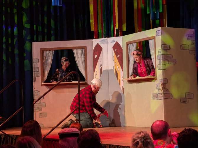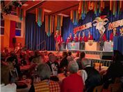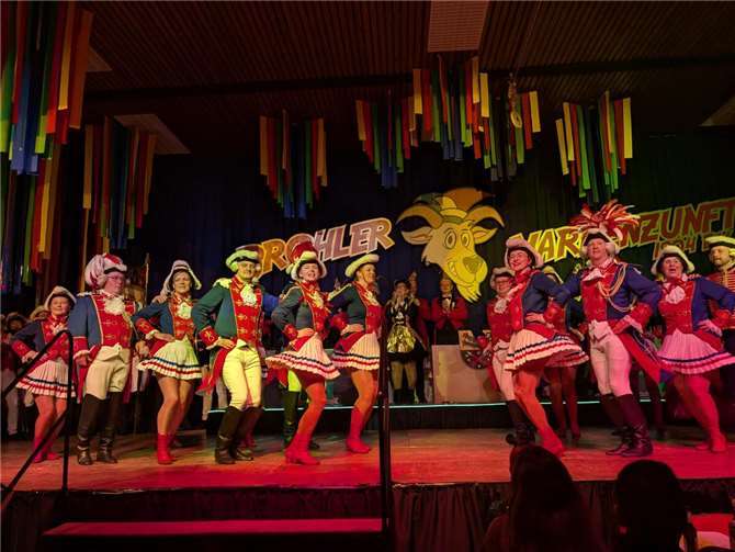 Als nächstes stand ein Auftritt der „Seven ups“ auf dem Programm. Die Nachwuchstruppe der Narrenzunft, die mit 7 Tänzerinnen begonnen hatte, ist mittlerweile auf 15 angewachsen und überzeugte mit ihrem schwungvollen Auftritt. Auf der Bühne abgelöst wurden sie von den Amazonen, die es bereits seit 1963 gibt. Auch sie ernteten viel Applaus für ihre tänzerische Darbietung. Viel Lokalkolorit und entsprechende Lachsalven erntete der Programmpunkt „Ost trifft West“: Zwei Nachbarinnen kommentieren von Fenster zu Fenster die Geschehnisse im Ort. Angefangen vom Glasfaserausbau mit dem „kleinen“ Bagger über Sportwagenfahrer und andere auffällige Zeitgenossen bekam so mancher sein Fett weg.
