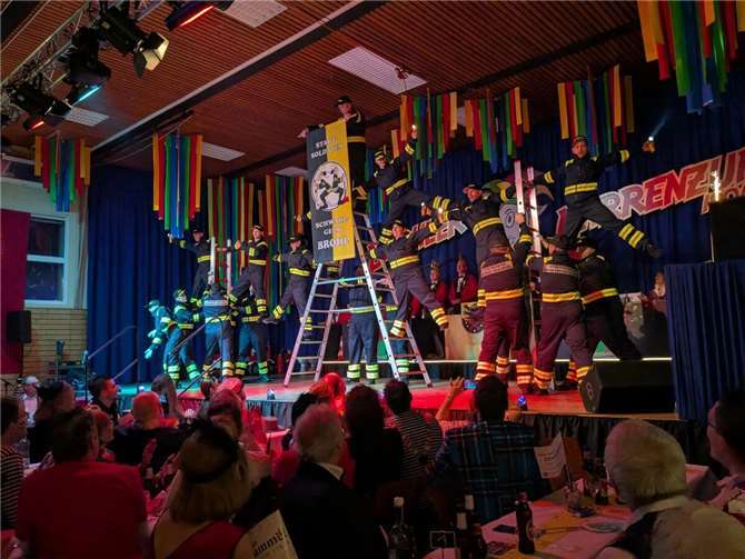 Reichlich Applaus und laute Zugabe-Rufe ernteten die „Stadt- Soldaten Schwarz-Gelb-Brohl“ für ihren Auftritt. Die Idee habe sich bei der Sitzung im vergangenen Jahr entwickelt, hieß es dazu. Nachdem eine Trainerin gefunden worden war, hätten die Mitglieder der Freiwilligen Feuerwehr sehr viel Zeit in das Einüben der Choreografie investiert – und das neben dem regulären Wehrbetrieb. Nach dem Tanz war das Publikum Feuer und Flamme.
