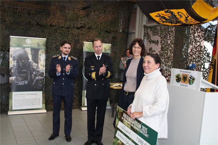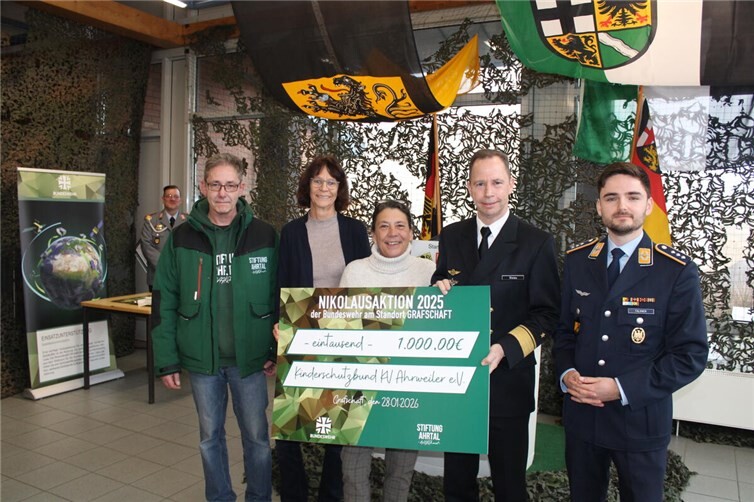Beim Jahresempfang des Standortältesten am Bundeswehr-Standort Grafschaft wurde unter anderem eine Spende von 1.000 Euro an den Kinderschutzbund Kreisverband Ahrweiler übergeben. DU