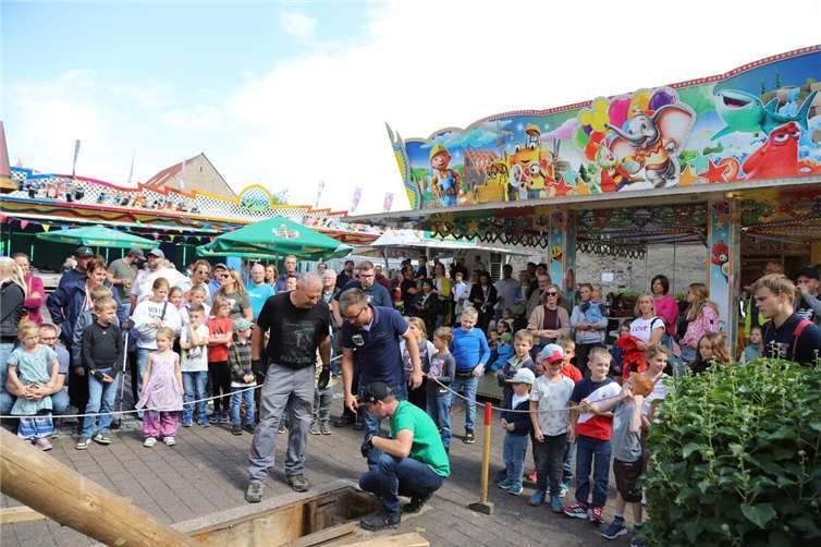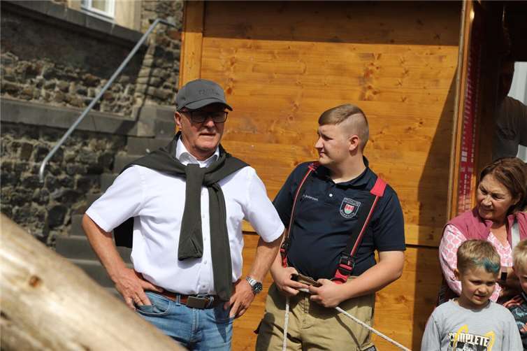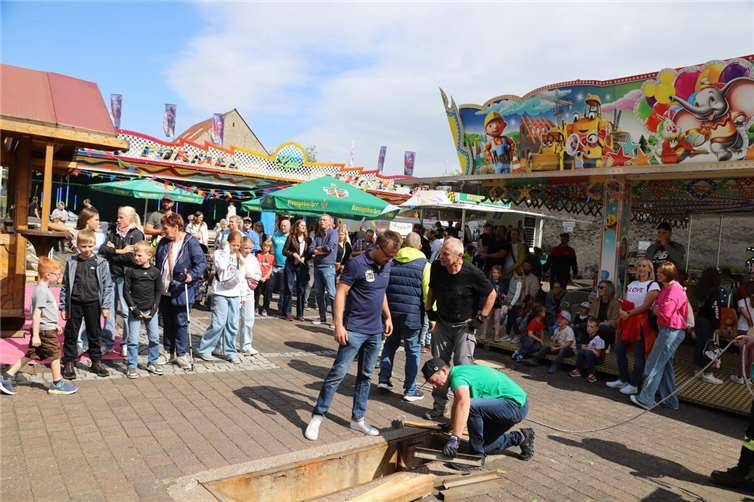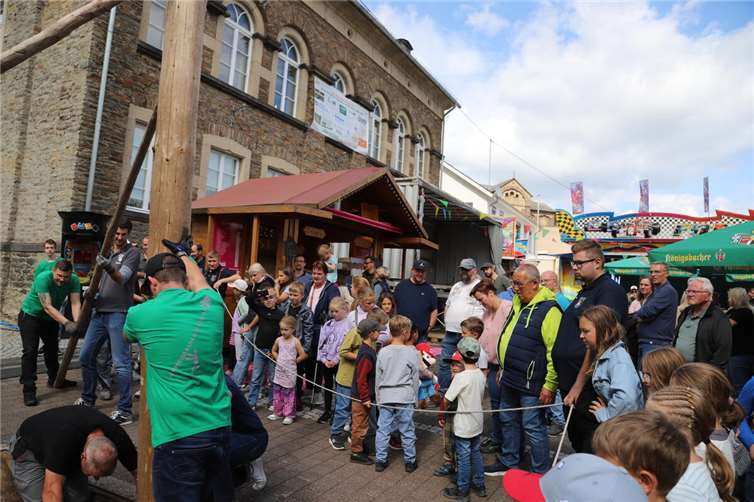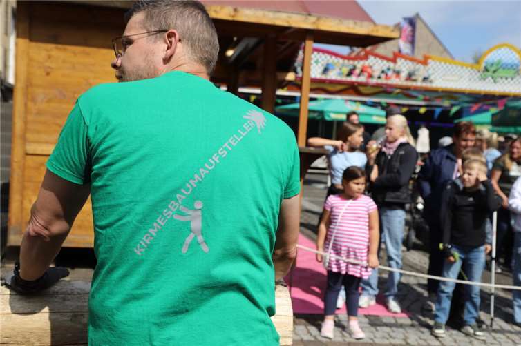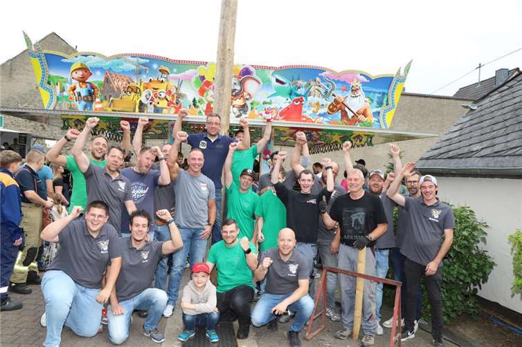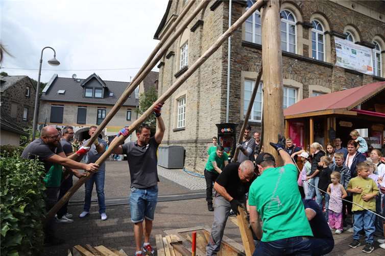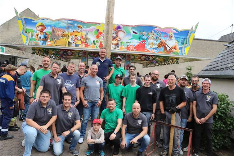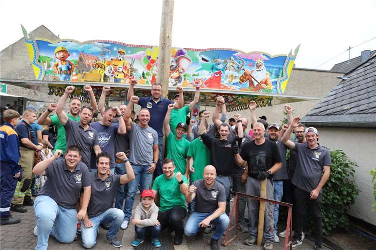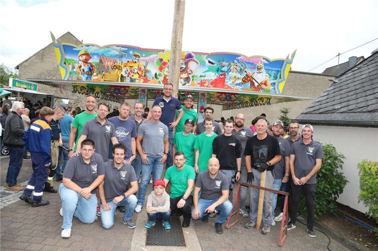 Rund 15 „kräftige Männer“ erledigten die Tradition des Kirmesbaum aufstellen unter den Augen zahlreicher Besucher am Samstagnachmittag in gewohnter Manier. Ortsbürgermeister Detlev Leersch verteilte im Anschluss für die kleinsten Besucher Freifahrtchips für das Kinderkarussell, die Jugendlichen erhielten Chips für den beliebten Auto-Scooter.