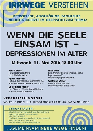 Neuwied. "Wenn die Seele einsam ist - Depression im Alter" heißt die Veranstaltung, zu der das Selbsthilfenetzwerk gemeindenahe Psychatrie e.V. in die Räumlichkeiten VHS Neuwied für Mittwoch, 11. Mai, 18 Uhr, in die Heddersdorfer Straße 33 einlädt. Einsamkeit ist oft ein Auslöser für Depressionen. Depressionen gehören neben demenziellen Erkrankungen zu den häufigsten psychischen Störungen im höheren Lebensalter. Zudem steigt laut einiger Statistiken das Suizidrisiko mit zunehmendem Alter, insbesondere bei Männern, drastisch an. Häufig werden depressive Symptome als normale Begleiterscheinung von Alter oder Lebenskrisen verkannt. So kommt es vor, dass Altersdepressionen nicht behandelt werden, weil sie niemandem auffallen oder aber weil die betroffene Personen aus einem Gefühl der Scham heraus nicht handeln. Die Landeszentrale für Gesundheitsförderung hat diese Problematik mit der Kampagne „Depressionen – in jedem Alter behandelbar“ aufgegriffen. Die Veranstaltung soll dazu beitragen, Ursachen, Krankheitsverlauf und Behandlungsmöglichkeiten von Depressionen im Alter aufzuzeigen. Der Verlust von Freunden oder des Partners, der Ausstieg aus dem Beruf oder Erkrankungen sind typische Situationen im Alter, die eine Depression auslösen können. Die Folge ist, dass sie dann erst recht keine Impulse mehr verspüren, Kontakte aufleben zu lassen oder neue Wege zu finden, Bekanntschaften zu schließen. Informationen zum Krankheitsbild sowie über die vorhandenen ambulanten und stationären Hilfen stehen somit im Mittelpunkt der Veranstaltung. Als Gesprächspartner konnten der leitende Oberarzt des Marienhaus-Klinikums St. Antonius Waldbreitbach, Dr. Reinhard Fröder, die Leiterin der Geriatrischen Tagesstätte der Rhein-Mosel-Fachklinik Andernach, Agnes Francois, die Vertreterin des Selbsthilfenetzwerk gemeindenahe Psychiatrie e.V. und Ansprechpartnerin der Selbsthilfegruppe Aufwind Erika Theis, der stellv. Vorsitzende des Seniorenbeirates Linz, Wolfgang Walter und ein Mitarbeiter des Pflegestützpunktes 1 Neuwied, Jens Arbeiter gewonnen werden. Die Veranstaltung findet in Kooperation mit dem Bündnis gegen Depressionen Rhein-Ahr-Wied statt, welches 2010 mit dem Ziel gegründet wurde, die Information über Krankheitsbild, Therapien und Hilfsangebote in der Region zu verbessern. Betroffene, Angehörige und Interessierte haben die Möglichkeit, sich zu informieren und an die eingeladenen Gesprächspartner ihre Fragen zu stellen. Der Eintritt ist frei, eine Voranmeldung ist nicht erforderlich. Weitere Infos bei Dr. Ulrich Kettler, Tel. (0 26 31) 8 03-7 32 oder -7 22, im Internet unter www.psychiatrie-neuwied.de.