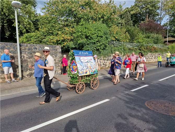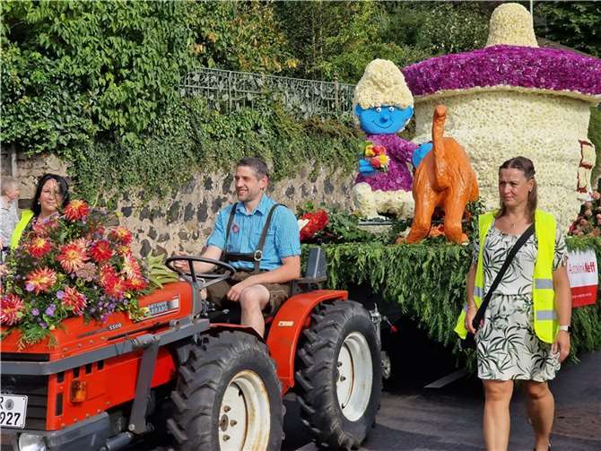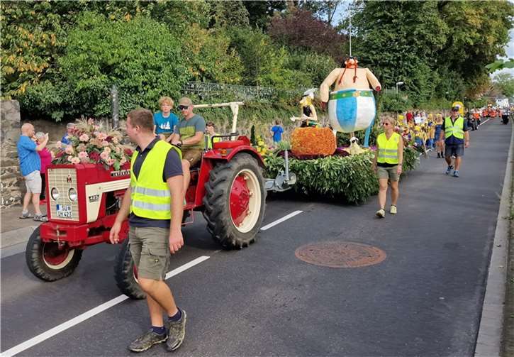 Es hat geklappt: Bei strahlendem Sonnenschein schlängelte sich am dritten Sonntag im September, das ist das traditionelle Weinfest-Wochenende in Erpel, ein bunter und grandioser Festzug durch die engen Straßen Erpels. Zwölf Fußgruppen, davon zwei reine Musikgruppen, drei Wagen-Anhänger mit Musikgruppen und zehn Blumenmotivanhänger, gezogen von Traktoren, begeisterten hunderte Zuschauer an den Straßenrändern. Und so konnte das Weinfest-Motto „Trinkt den Wein in Erpel am Rhein,“ um das Zugmotto „Comic-Helden laden zum Verweilen ein“, blumig ergänzt werden. Denn nicht etwa lediglich schöne Sträuße, Mosaiken und Gestecke wurden präsentiert, sondern Comic-Helden. Tim und Struppi, Asterix & Obelix, Onkel Dagobert, Lucky Luke und die Schlümpfe waren aufwändig aus tausenden Blüten gesteckt und nachgebildet.