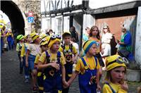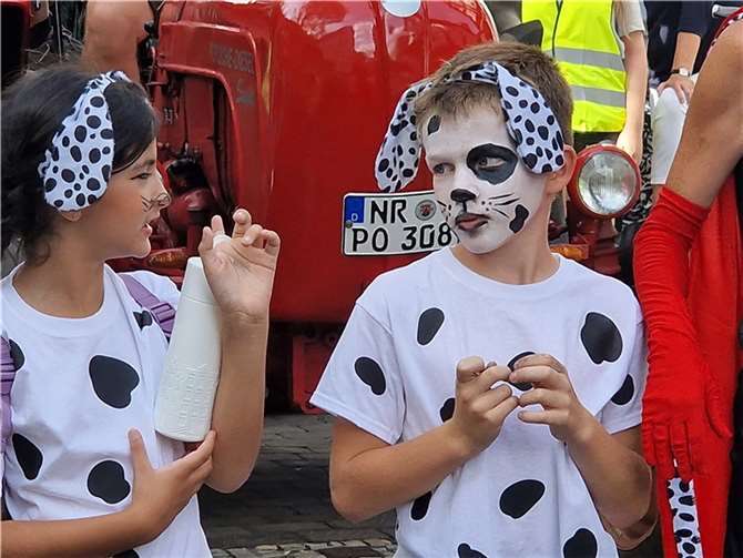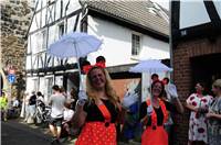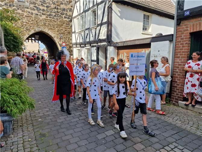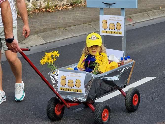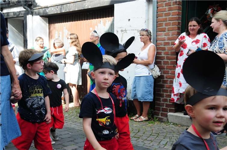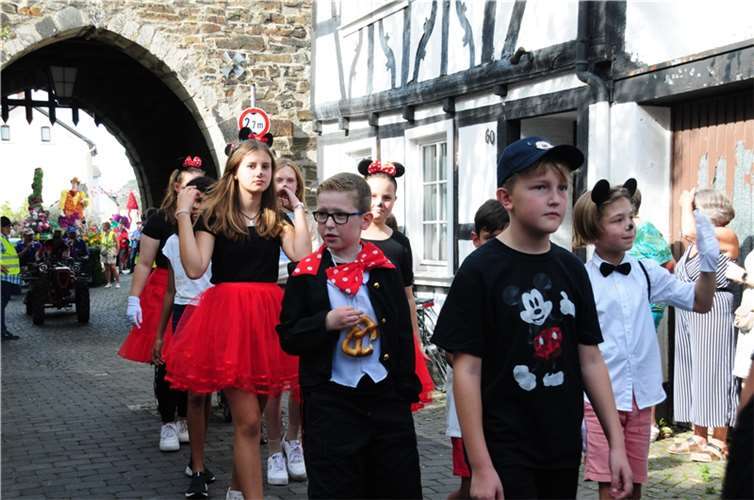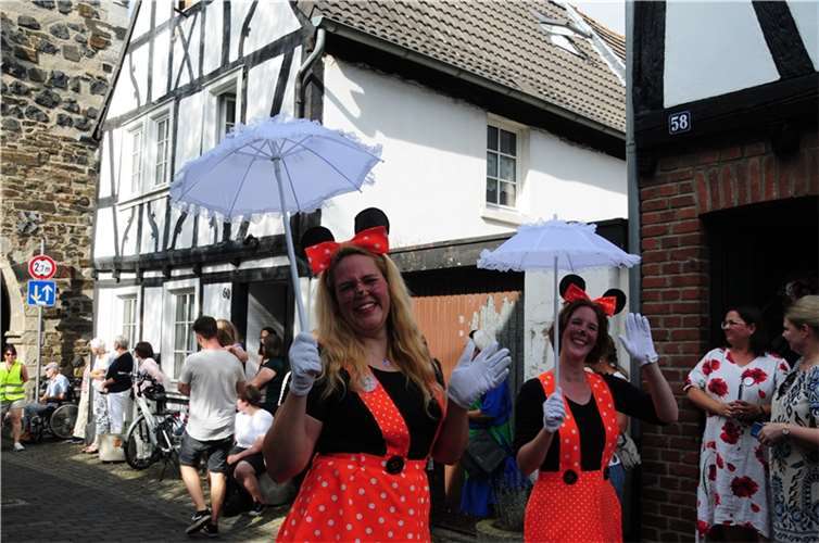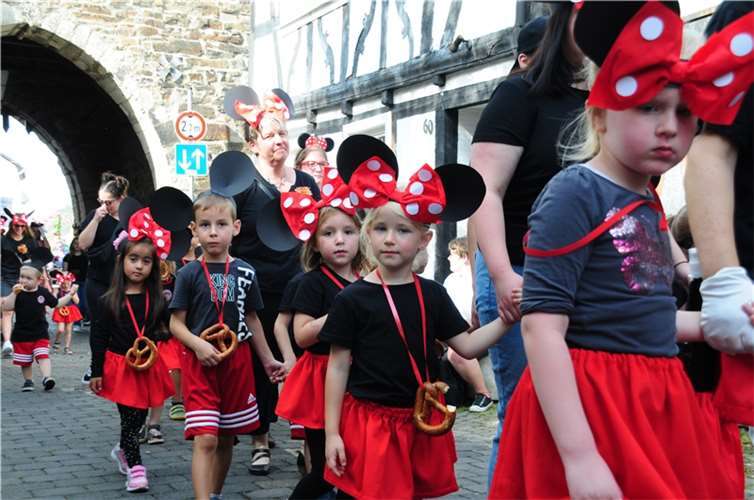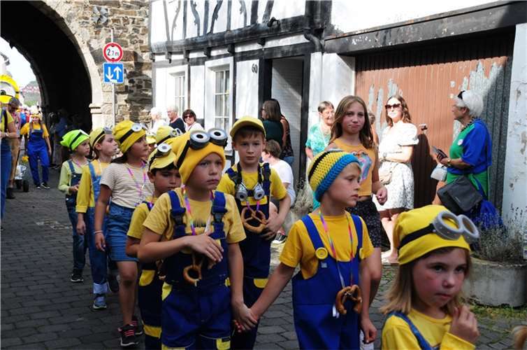 Und klar, auch die Fußgruppen, die Möhnen, insbesondere aber die des Kindergartens Regenbogenland und der Erpeler Grundschule St. Johannes, zeigten sich im Comic-Outfit: Nicht ganz 101 Dalmatiner waren dabei, dafür viele Minnie Maus und Mickey Maus– Ausgaben, Super Mario und gelbe Minions. Natürlich winkten die Erpeler Weinmajestäten, Königin Lara I. Dommermut mit Prinzessinnen Alicia Ott und Noa Mundus von einem festlichen, comicfreien Blumen-Kronen-Wagen, ebenso wie Bacchus Dominik (Schwager), der mit seinen Bacchantinnen Lea Marie Warnke und Jaqueline Scholl auf farbenfrohem Blütenmuster saß und den Zuschauern zuprostete. Auch Mittelrhein-Weinkönigin Verena Schwager fuhr mit auf dem Korso und strahlte mit den Besuchern und der Sonne um die Wette.