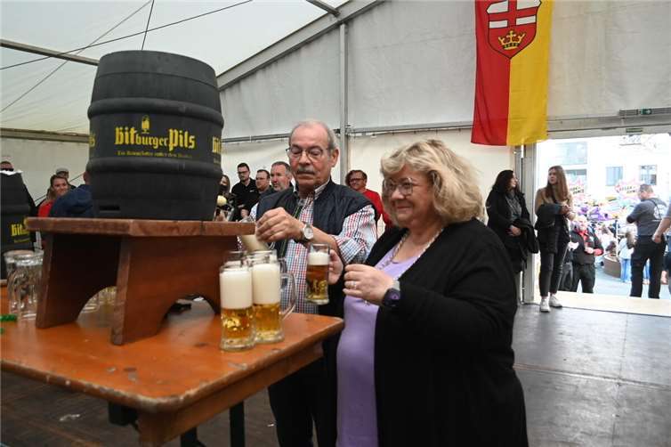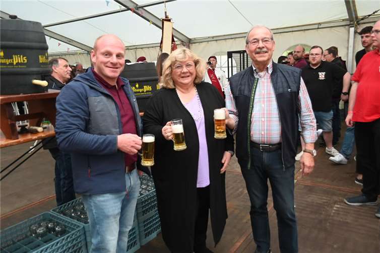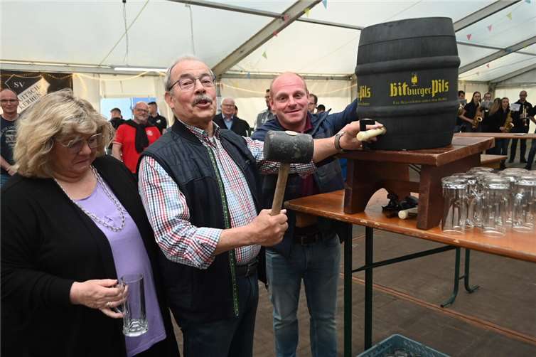 Beim anschließenden Fassanstich waren alle Vereine im Festzelt vertreten. Der erste Beigeordnete Robert Brand bedankte sich zunächst bei den beiden Kolleginnen aus dem Stadtbüro, Steffi Stobrawe und Laura Schink, bei den Mitarbeitern des Bauhofs und beim Marktmeister Dirk Krohmann für die Organisation. Beim Anschlagen wurde Brand unterstützt von der zweiten Beigeordneten Claudia Blotzki und vom dritten Beigeordneten Stefan Reck. Stadtbürgermeister Gerd Klasen ließ sich entschuldigen: Er weilte mit seiner Familie in Oschersleben in der Nähe von Magdeburg, wo sein Sohn Matti beim ADAC-Junior-Cup an den Start ging. Der Bevölkerung machte das wenig aus. Die Polcher Bürger zeigten, dass sie auch ohne Stadtoberhaupt vernünftig feiern können.