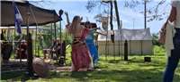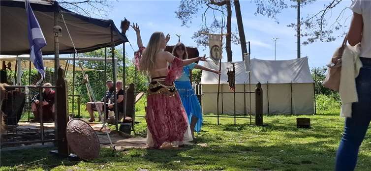 Ein weiterer Höhepunkt des Programms war eine Bauchtanzdarbietung von Layla und Sophie die ihre Künste Füst Atakam präsentierten. Für die Hungrigen Gäste standen handgemachte, mittelalterliche Brotspeisen zum Kauf bereit, die in der alten Tradition in Holzöfen gebacken wurden. Aber auch die klassische Wurst wurde an einem Imbisswagen verkauft. Es war für jeden Geschmack etwas dabei. Die Unkeler Hunnen unterstützen mit ihren Einnahmen krebskranke Kinder. Am Samstag, 26.04. übergaben sie Spenden an den Förderkreis Bonn und an Dar Kölsche Hätz.