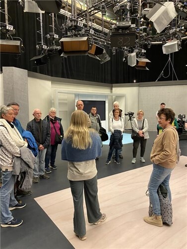 An einem sonnigen Apriltag ging es teilweise vier Etagen unter die Erde, um die Studios zu besichtigen, welche sich unter dem Wallraffplatz befinden. So schnupperte die Gruppe Fernsehluft im „Moma“-Studio, wo das Morgenmagazin im Wechsel mit dem ZDF alle zwei Wochen produziert wird. Man sah die „kleinste Bühne der Welt“ und wunderte sich über die Kulisse, welche innerhalb von sieben Minuten völlig umgebaut werden kann. Hunderte von nummerierten Scheinwerfern an der Decke sorgen für das richtige Licht. Auf dem Boden sind ebenfalls etliche nummerierte Markierungen.