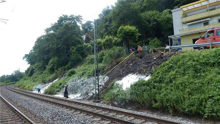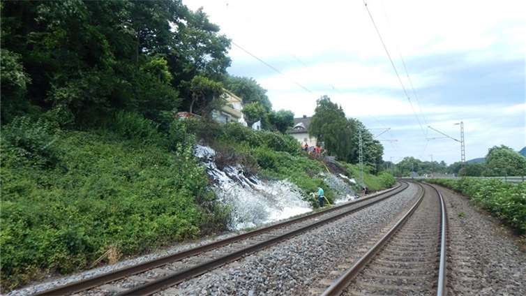 Remagen. Heute, 7. Juli, gegen 11:37 Uhr, befuhr ein Güterzug die Zugstrecke von Bonn in Richtung Koblenz. Ab dem Remagener Stadtteil Rolandswerth blockierten die Räder zweier Güterwagons. Durch den anschließenden Funkenflug geriet der Bahndamm im folgenden Streckenverlauf an insgesamt fünf Stellen bis Sinzig in Brand. Im Waldbereich von Remagen - entlang der B9 - bestand die Gefahr, dass dieser Band in einen großflächigen Waldbrand übergeht. Durch die alarmierten Feuerwehreinheiten Remagen und Sinzig konnte der Brand schließlich gegen 13:00 Uhr gelöscht werden. Die B 9 war zwischenzeitlich im Bereich von Rolandswerth und Oberwinter in beide Fahrtrichtungen gesperrt.