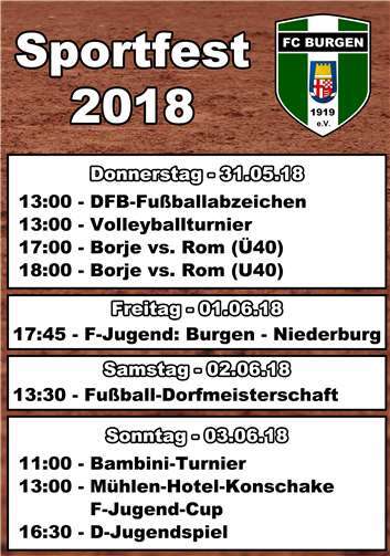 Burgen. Am Samstag, 26. Mai, findet ein Arbeitstag zur Vorbereitung auf das Sportfest statt. Um 10 Uhr wird der Saubermannstag auf dem Sportplatz beginnen. Um reges Erscheinen wird gebeten. Auch in diesem Jahr findet das Sportfest am Fronleichnam-Wochenende statt. Von Donnerstag, 31. Mai, bis Sonntag, 3. Juni gibt es an jedem Tag ein tolles Rahmenprogramm. Für das leibliche Wohl ist an allen Tagen bestens gesorgt. Alle aktuellen Informationen rund um den Verein und die vollständigen Berichte und Fotos der Spiele gibt es unter www.fcburgen.de.